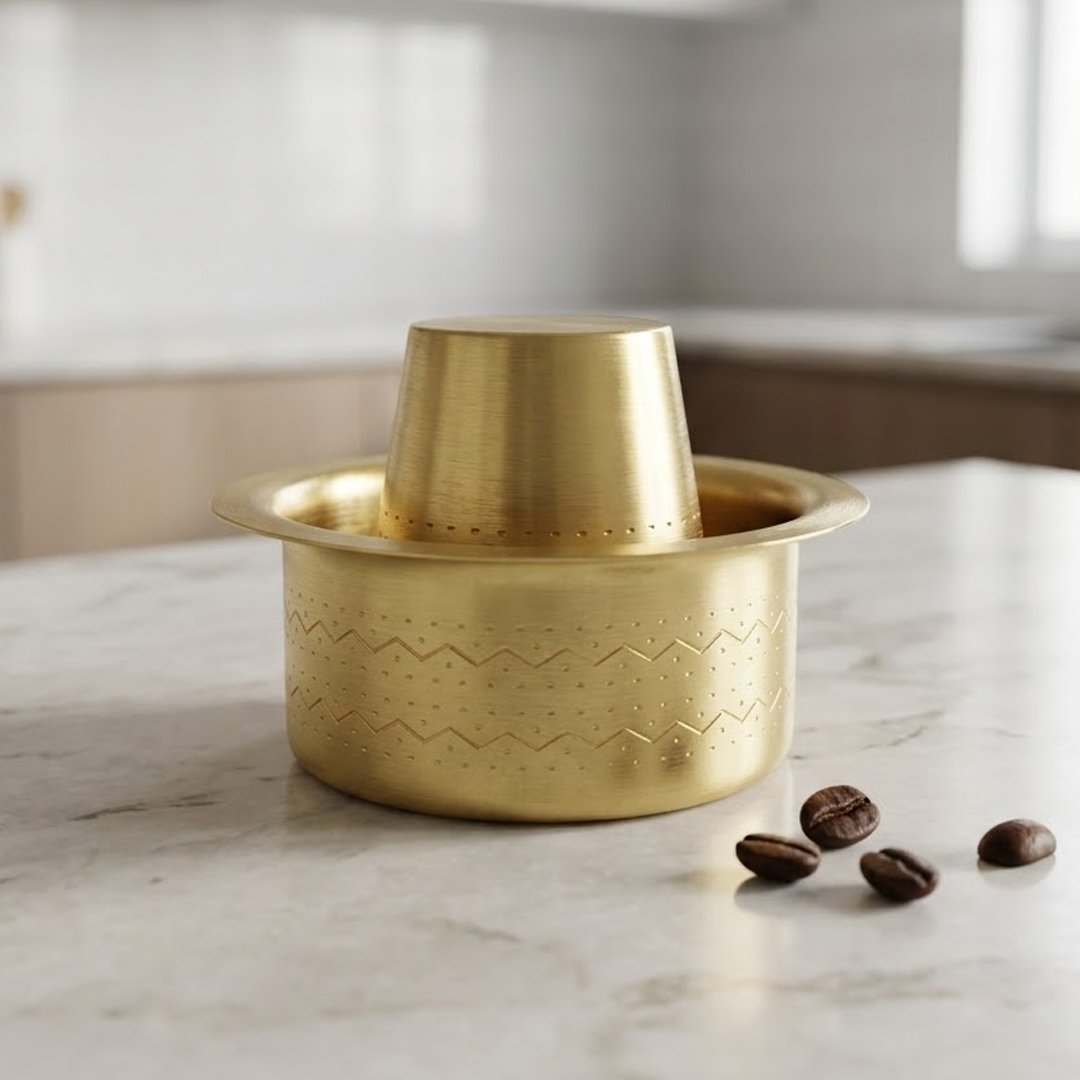 Brass, a traditional alloy of copper and zinc, has long been valued for its therapeutic qualities and has been used for serving coffee for generations. Paired with the classic coffee filter and davara, brass was traditionally believed to help balance the brew’s acidity while enhancing its depth of flavour and overall richness.